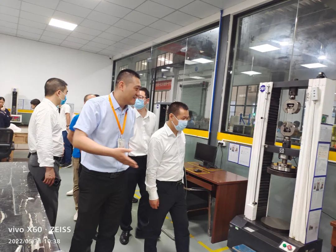 在檢測室,吳縣長參觀了材料的檢測設備、彈簧的特性檢測設備以及疲勞檢測設備,同時鼓勵我們多做測試,積累數據,了解并掌握材料在制作和使用中的力學分布情況,讓彈簧的性能達到極致。